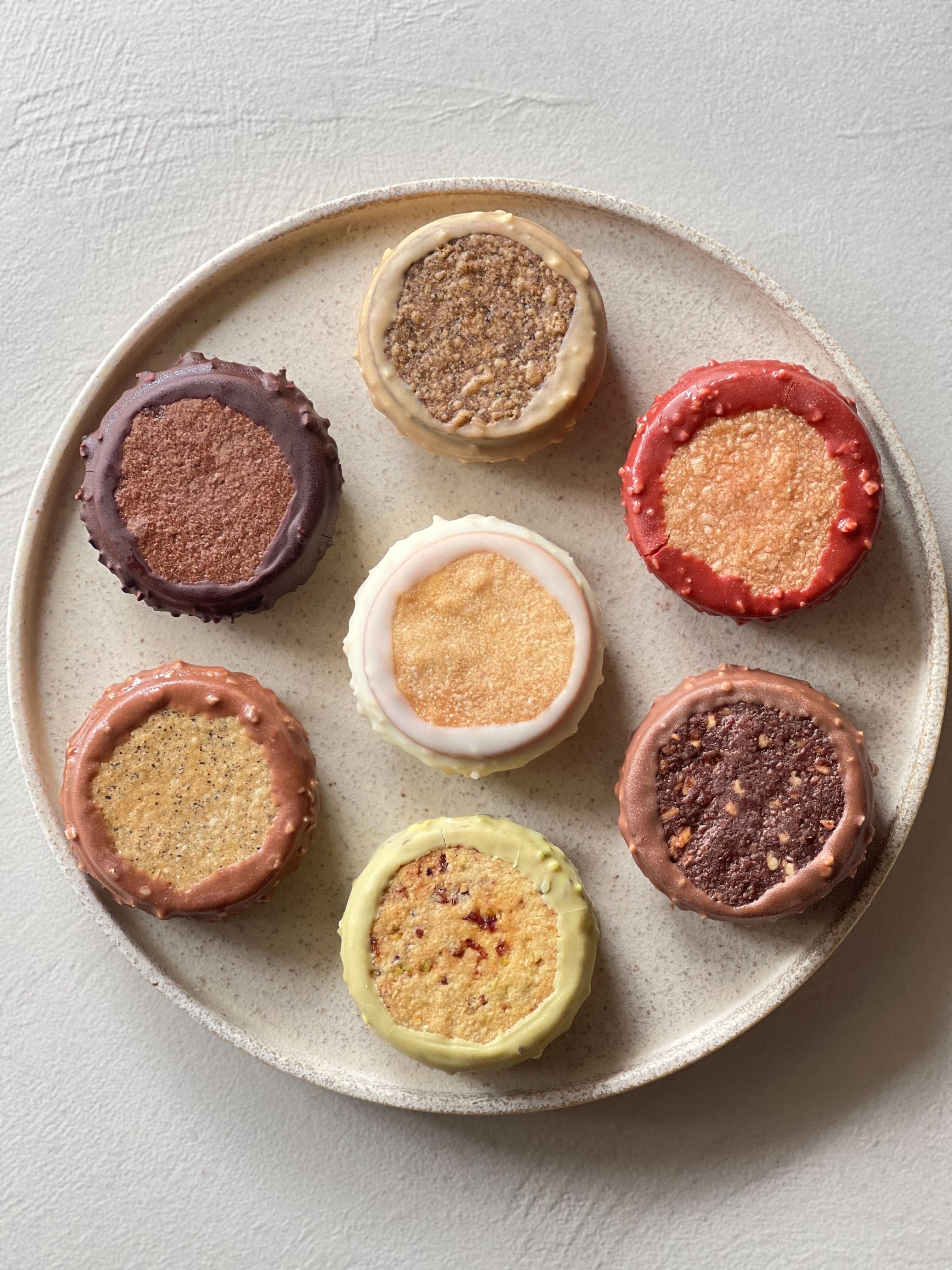 フランボワーズ風味のビターガナッシュをショコラマカダミアサブレでサンド