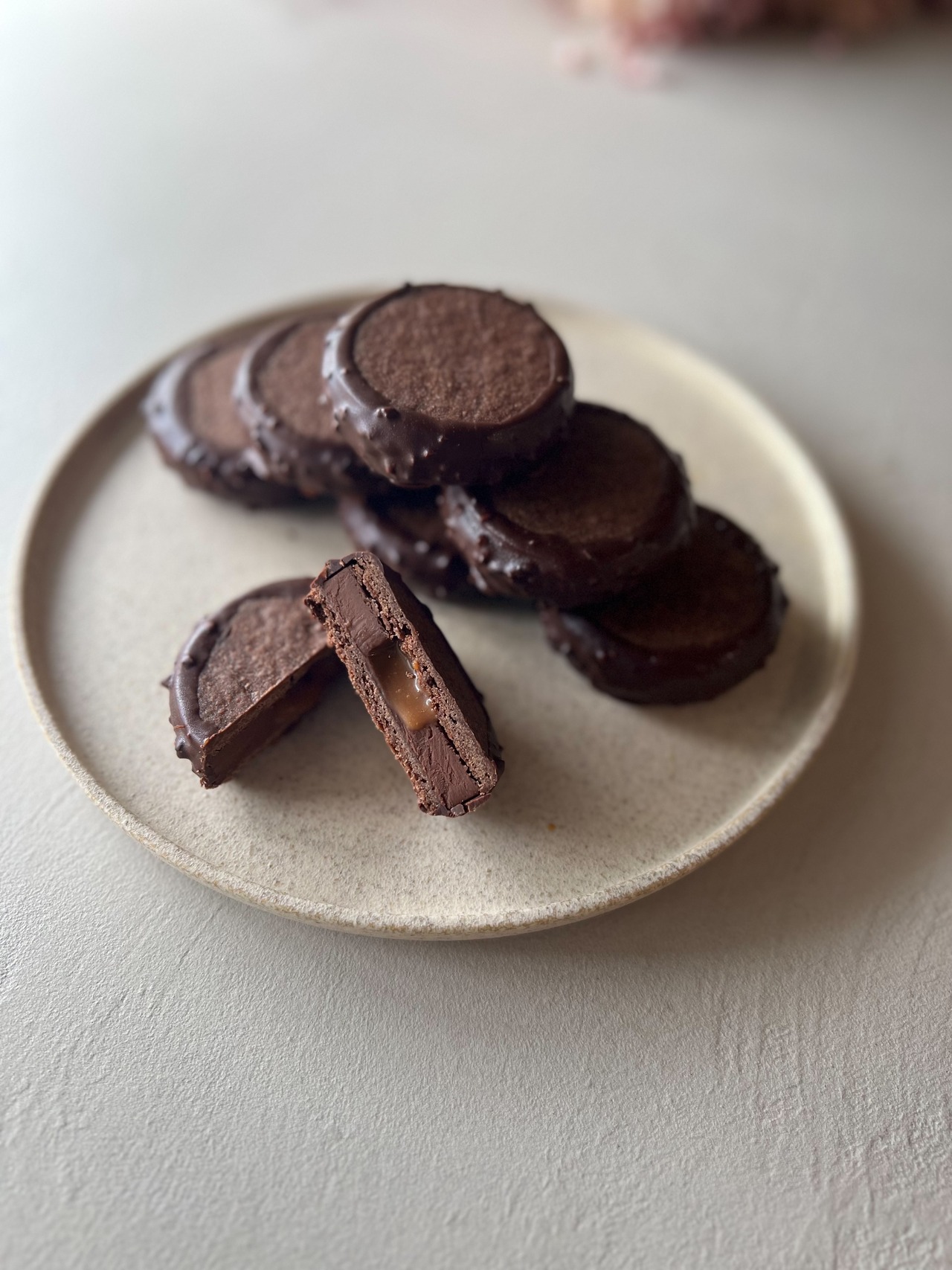 塩キャラメルソースを忍ばて、カカオサブレでサンド
