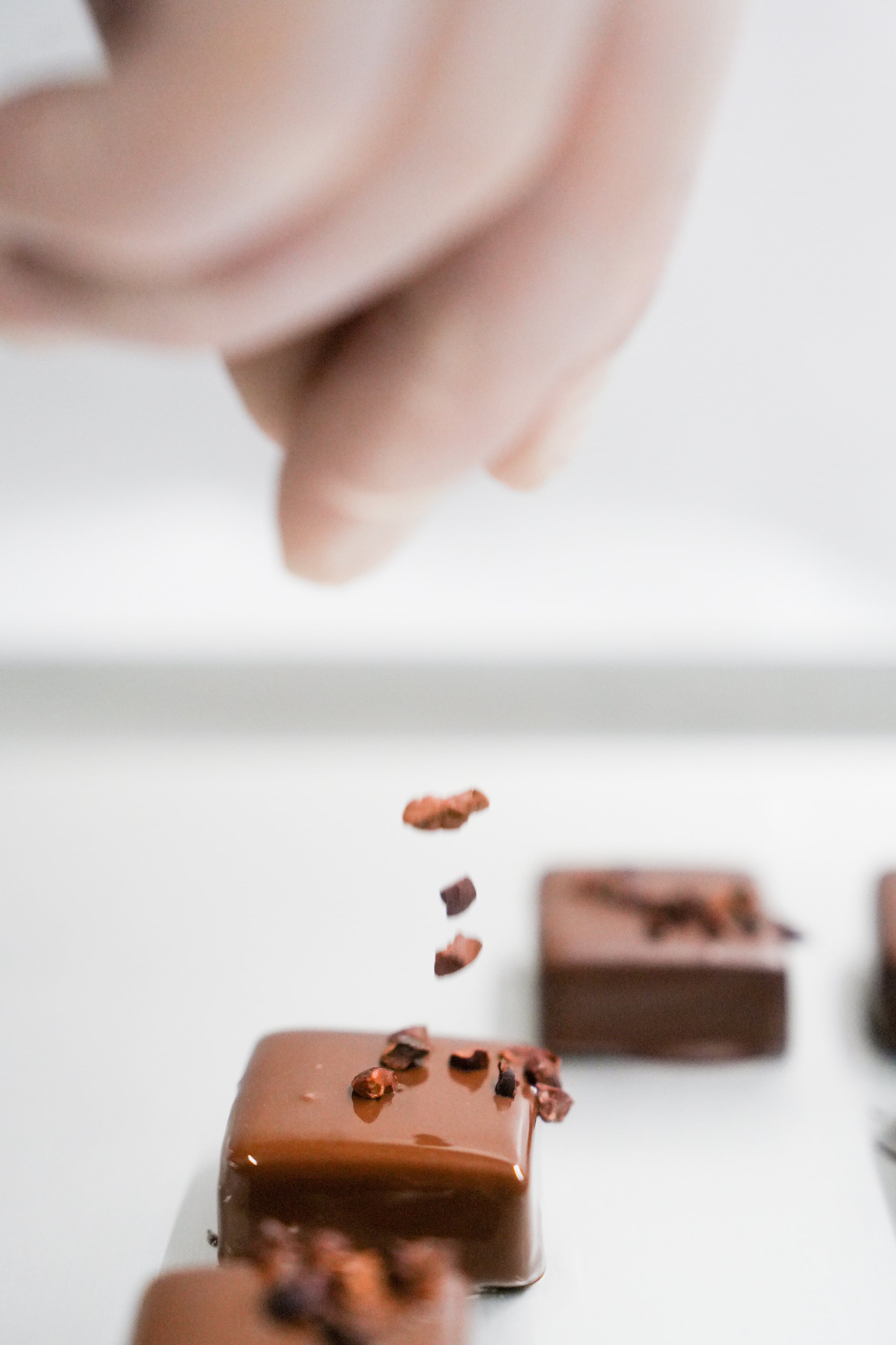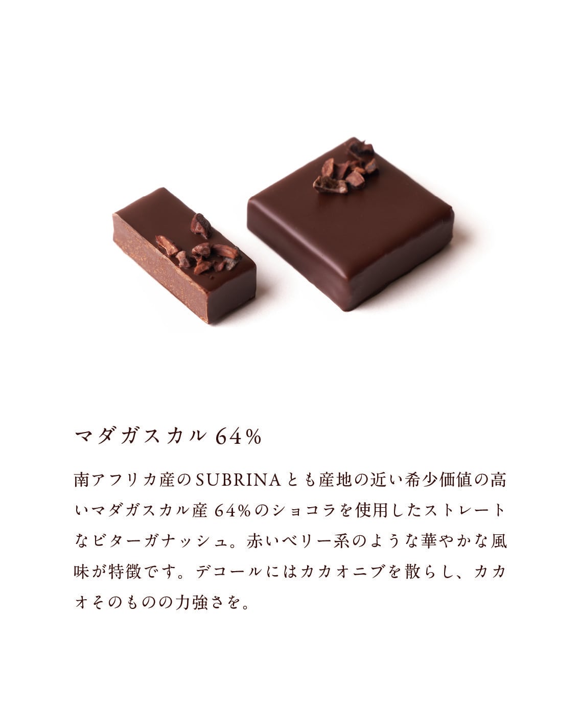 南アフリカ産のワインとも産地の近いマダガスカル産6 4 % のショコラを使用したストレートなビターガナッシュ。赤いベリー系のような華やかな風味が特徴的。デコールにはカカオニブを散らし、カカオそのものの力強さを。