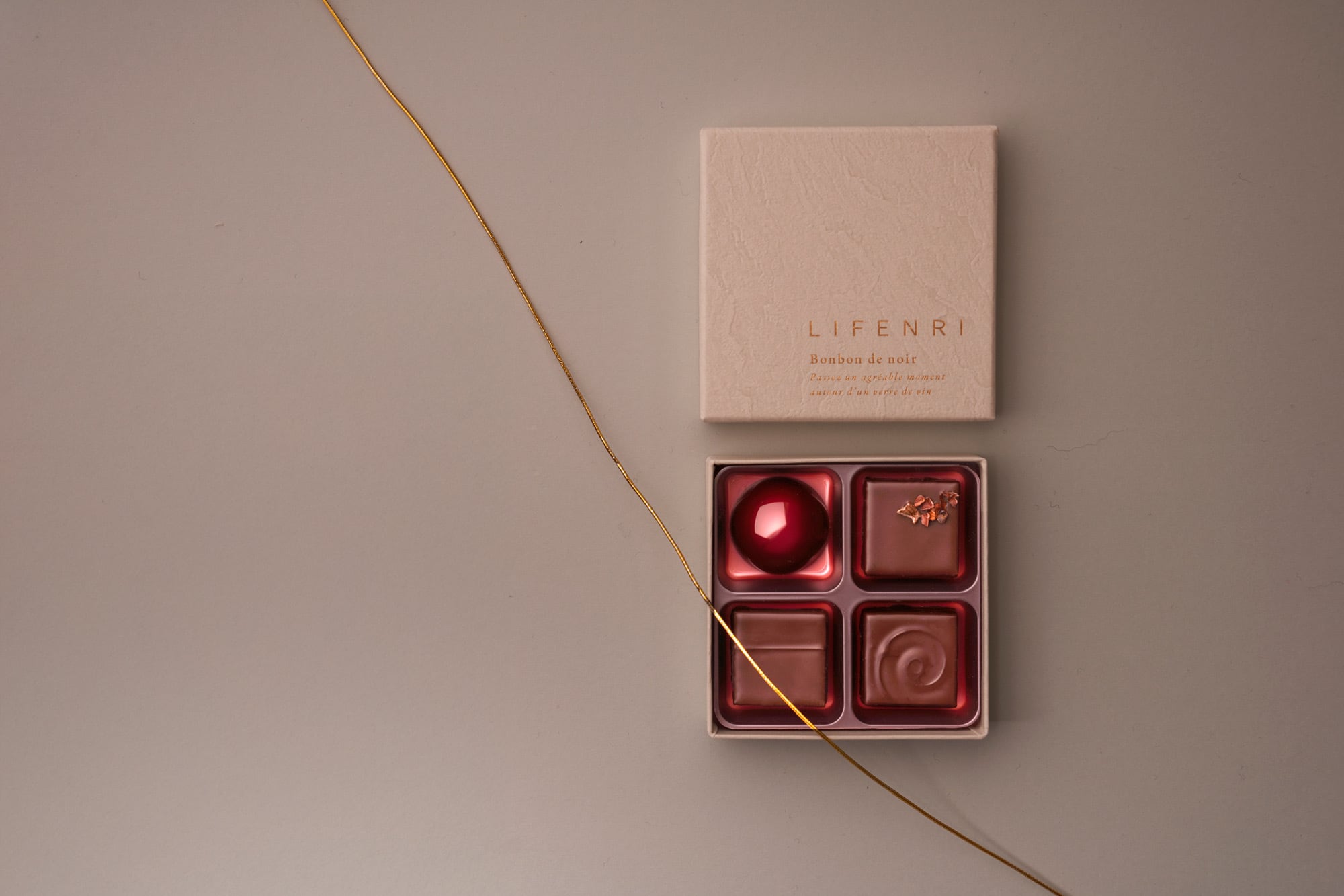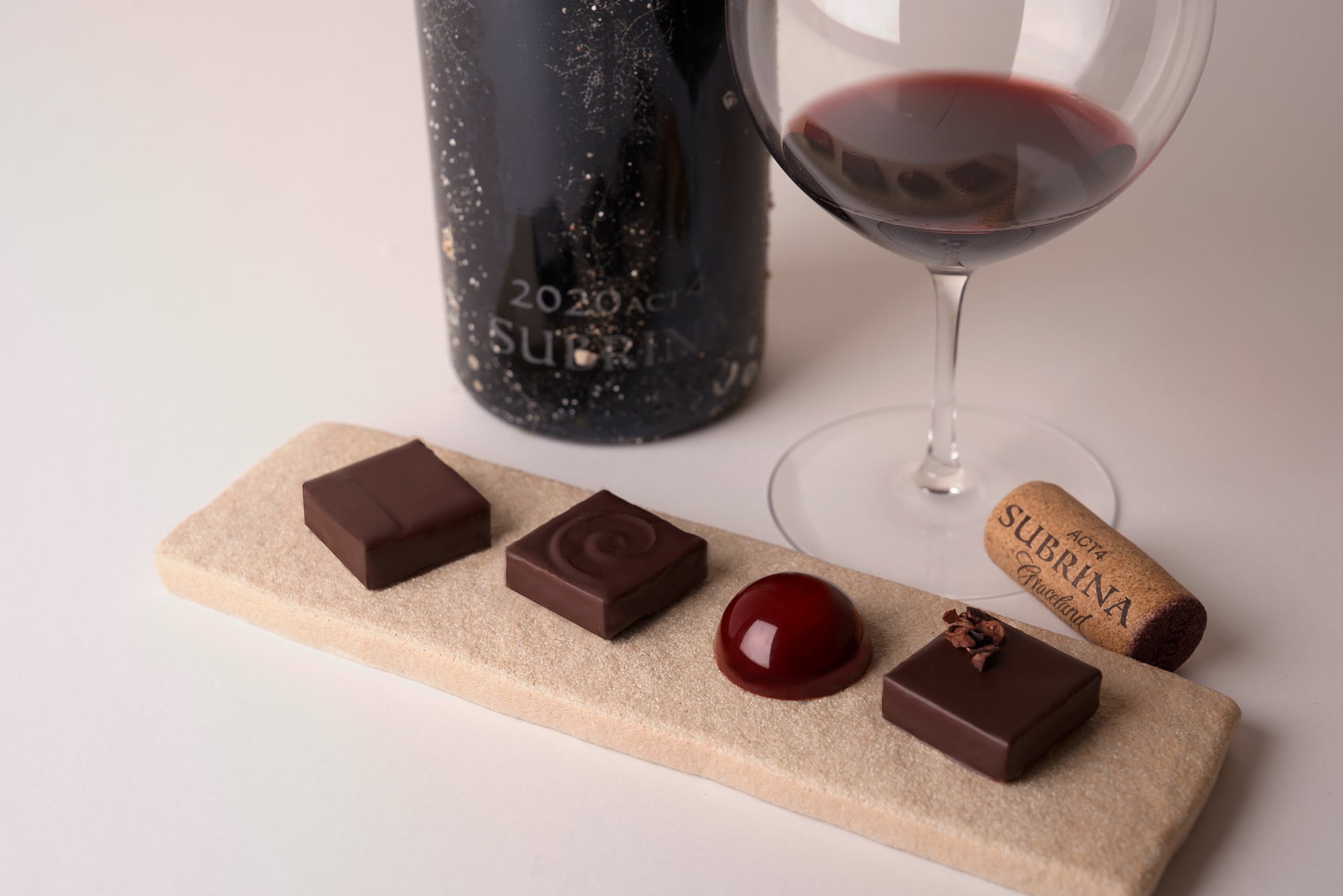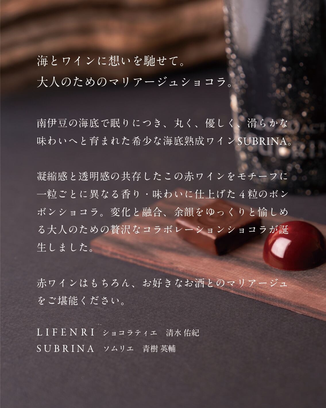 海底熟成ワインSUBRINAとLIFENRIによる⼤⼈のための⾹り・味わいの異なる4粒のマリアージュボンボンショコラをご用意いたしました。