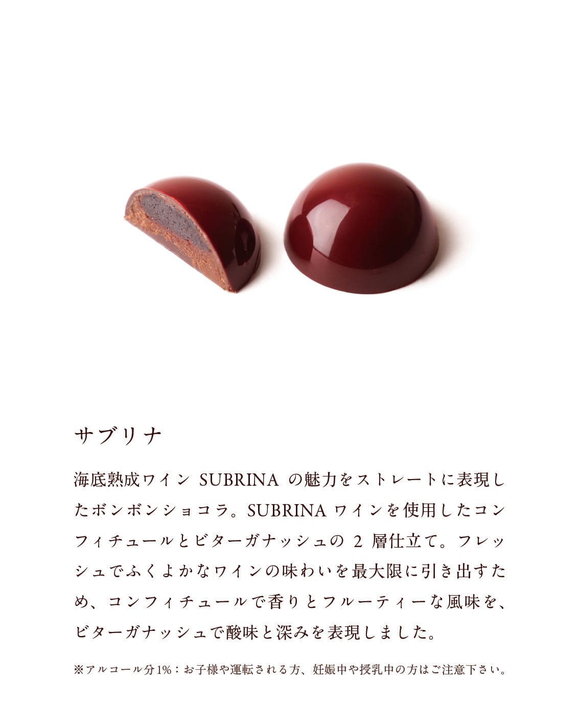海底熟成ワイン SUBRINAをストレートに表現したボンボンショコラ。コンフィチュールとビターガナッシュの2層仕立て。SUBRINAのフレッシュながらもふくよかな味わいをいかすため、ワインの香りとフルーティ感をコンフィチュールで、酸味と風味をビターガナッシュで。※アルコール分1%を含みます。