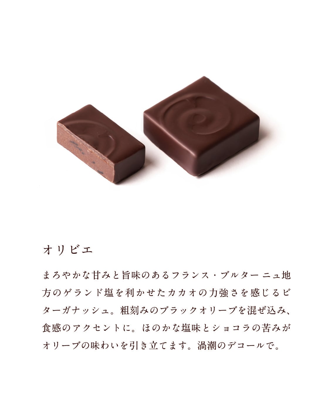 まろやかな甘みと旨味のあるフランス・ブルター ニュ地方のゲランド塩を利かせたカカオの力強さを感じるビターガナッシュ。粗刻みのブラックオリーブを混ぜ込み、食感のアクセントに。ほのかな塩味とショコラの苦みがオリーブの味わいを引き立てます。渦潮のフォルムで。